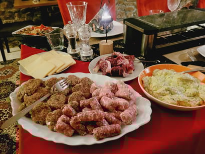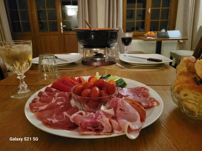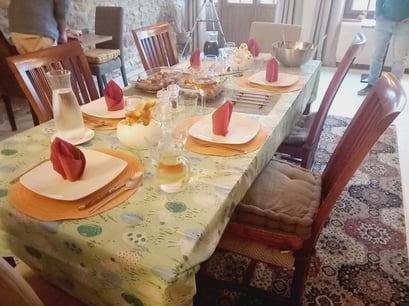 It is possible to have dinner at Chambre d'hôtes Le Puy Maury the whole year round (unless we have made plans) in the diningroom or on the terrace of the Bed and Breakfast at 19.30. For the price of € 27,00 (entree = € 6,00; main = € 15,00; dessert = € 6,00) per person you can enjoy a 3 course meal prepared by us, excluding beverages. It varies daily, is mostly homemade and we use as much local organic products as possible.